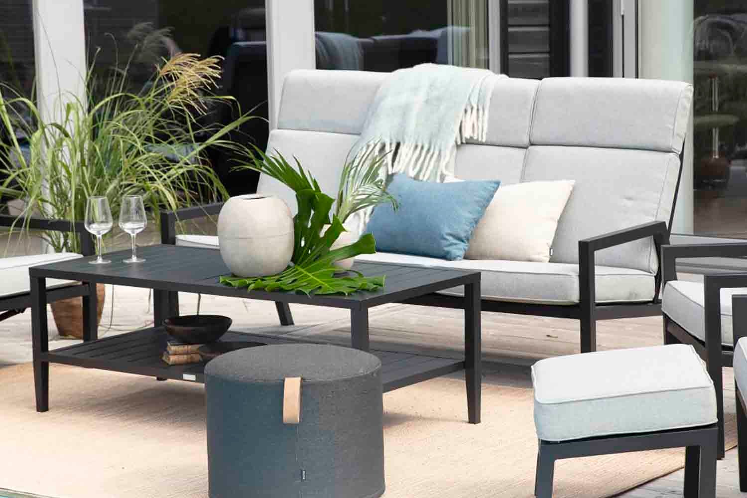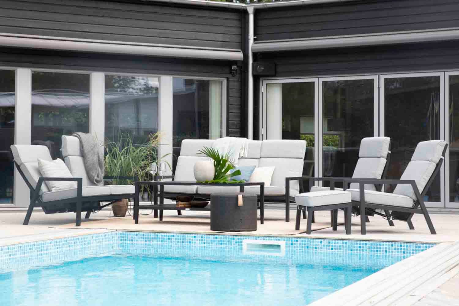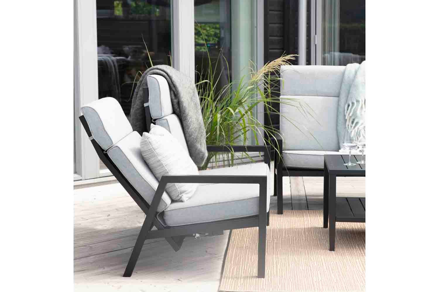 En moderne loungeserie med utmerket sittekomfort. Du kan velge mellom matt hvit eller svart aluminium med grå textilene og putene som følger med er av høy kvalitet og trukket med olefinstoff. Serien består av flere separate deler som gir deg friheten til å skape en hyggelig og funksjonell uteplass, enten den er liten eller stor.