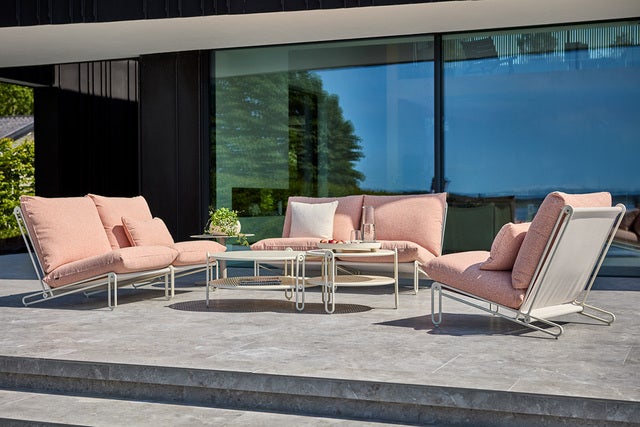 Moderne byggbar sofa/stol i loungestil med aluminiumsramme og sete i textilene. Komfortable puter trukket i mykt olefinstoff med vannavvisende belegg. Innbydende design og høy fleksibilitet: Bygg enten en enseters lenestol eller en lengre sofa med alle sitteplassene du trenger. De åpne avslutningene lar deg også sitte på sidene. Bordene, som kan brukes hver for seg eller sammen, har en perforert bordplate. Det er en fin designdetalj og også en smart funksjon som lar vannet strømme gjennom.