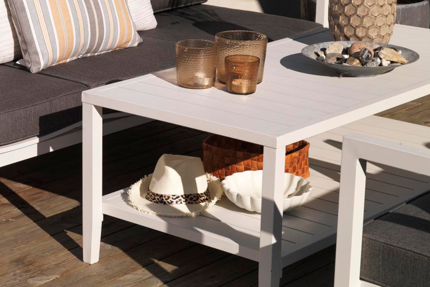 Salongbord i mattlakkert aluminium i forskjellige størrelser med praktisk avishylle.