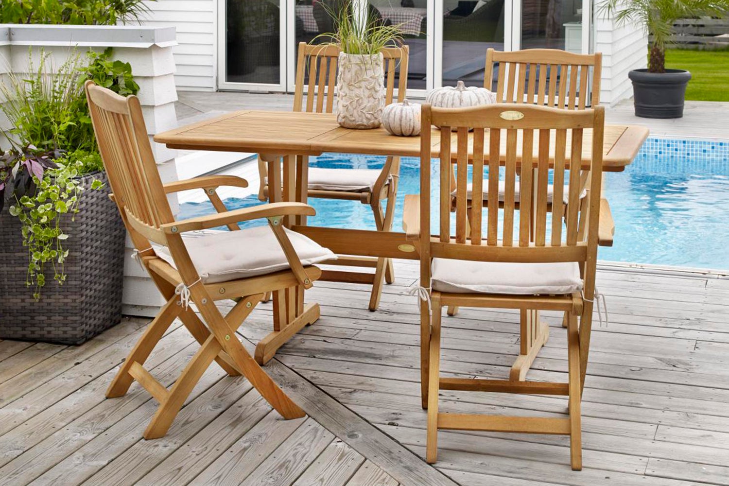 Filippa er laget av naturlig teak og finnes både som sammenleggbar stol og lenestol, som også er sammenleggbar. Du kan pent kombinere dem med et av våre teakbord.