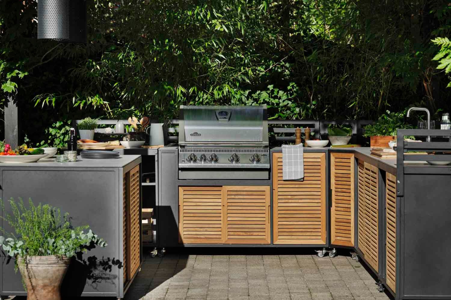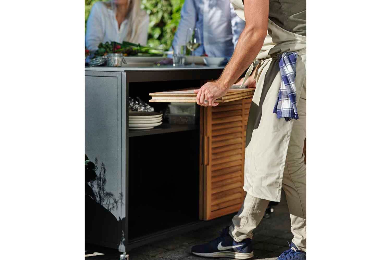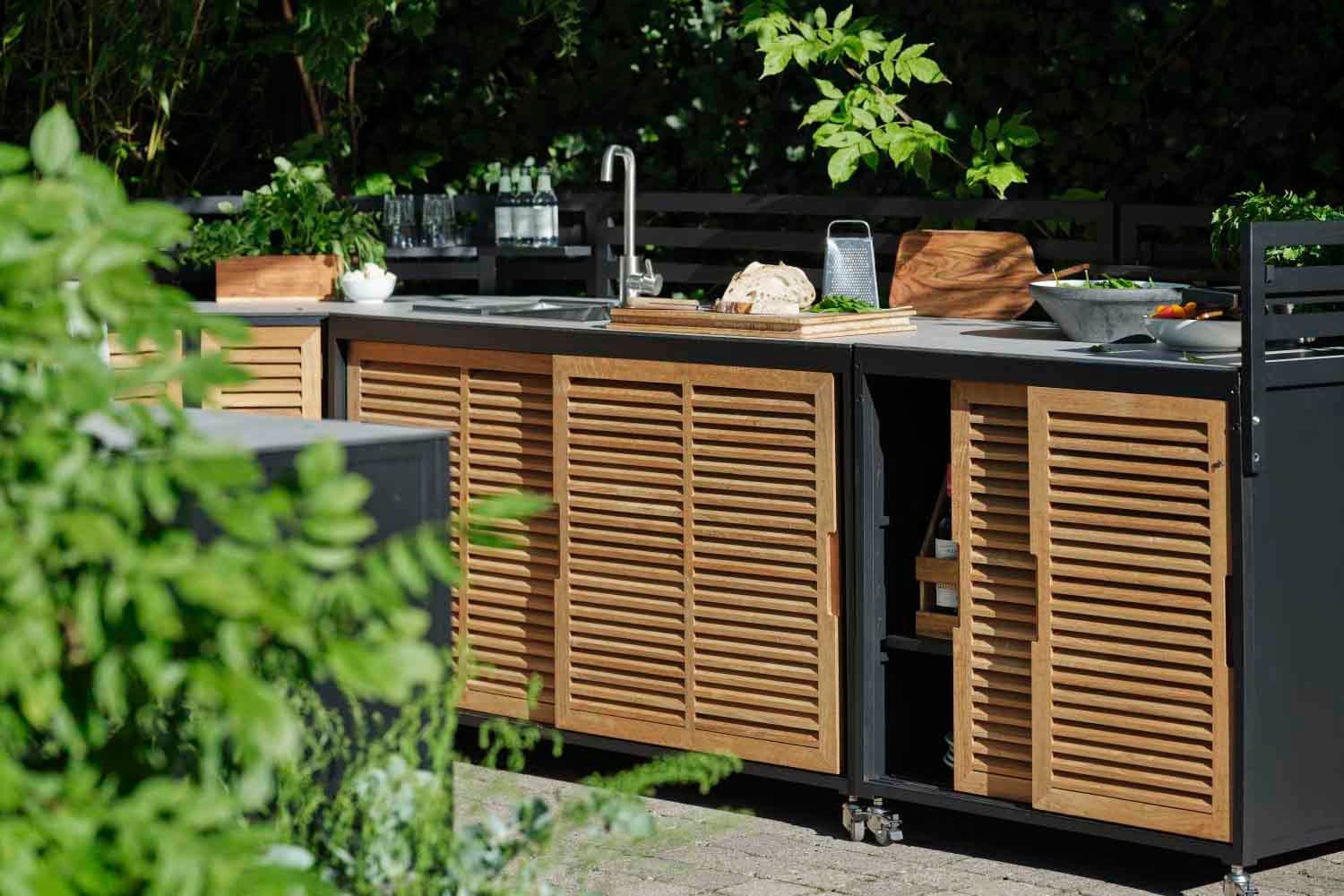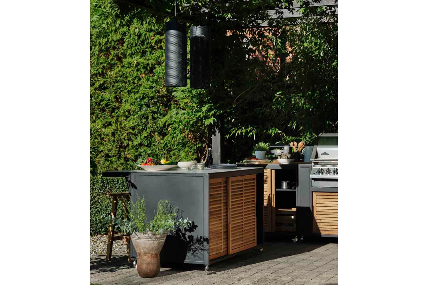 Et premium utekjøkken i svart aluminium med teakdører og en plate i høytrykkslaminat. Designet for moderne livsstil og med mange smarte funksjoner. Fornax består av 5 forskjellige enheter som kan settes sammen på forskjellige måter for å lage et komplett og stort utekjøkken. En enhet er forberedt på å legge til en grill, en enhet har vask og vannkran, og en enhet har en glatt topp, perfekt som arbeidsflate. Alle enhetene har solide hjul, bak/gjerde og hylle. Som tilbehør er det også en topp (stor og liten) som kan monteres på en bardisk.