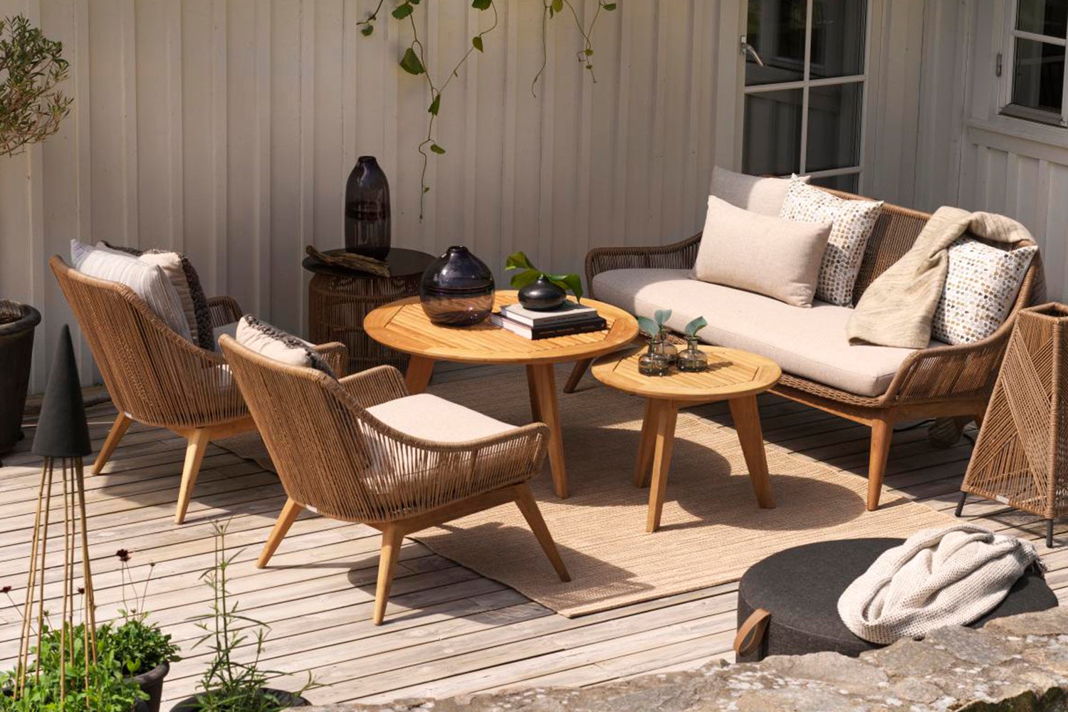 Tidløst design i en varm og innbydende stil, dekorativt flettet og en klassisk teakramme. Seteputer inkludert. Høy fleksibilitet: Bruk dine egne puter på ryggen og forny stil og design når stemningen slår til.