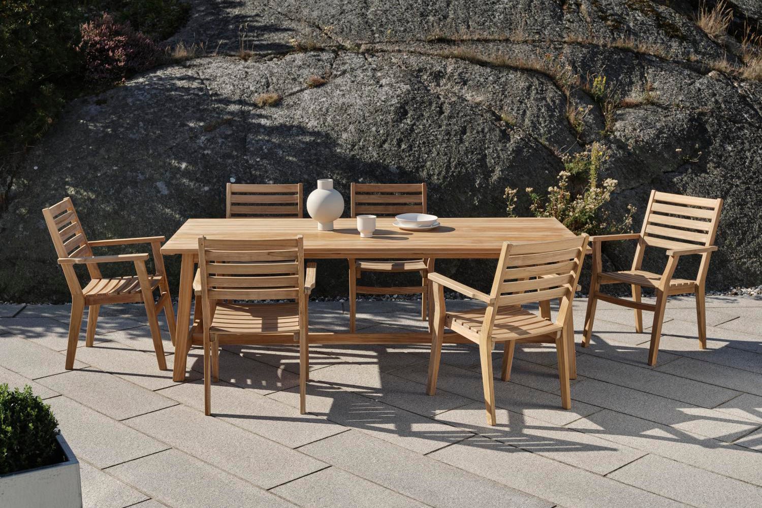 Keros; En serie i stilig naturteak. Serien inkluderer spisebord, bordhylle, lenestol og benk; Alle med samme stilige og myke form på brett.