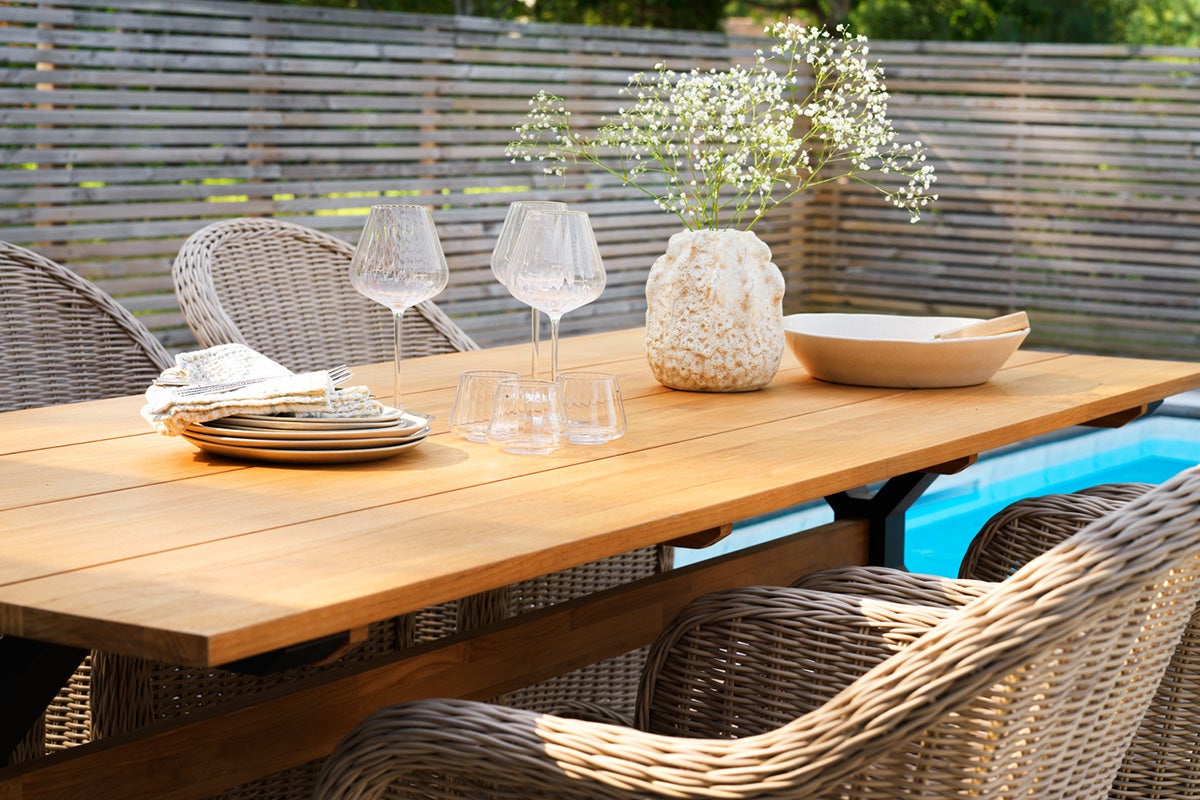 Mark er et spisebord der rustikk varme møter industriell følelse. Den solide teaktoppen er kombinert med tverrbein i aluminium og skaper en kraftig blanding av naturlig og moderne. Justerbare føtter sikrer stabilitet selv på ujevne overflater.