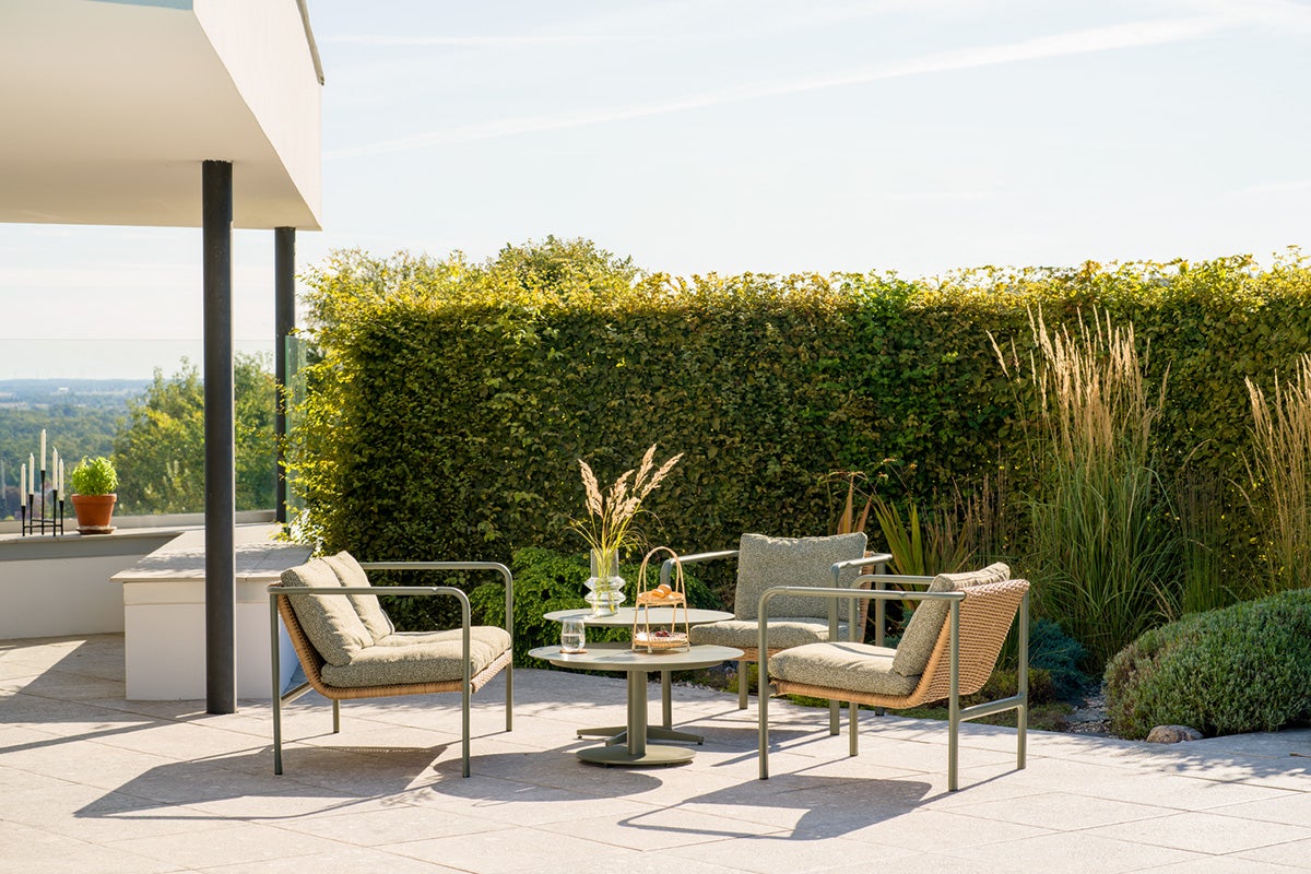 Myke former og en naturlig inspirert rottinglook gir Motty både komfort og stil. Serien er tilgjengelig i fargene Zin Red, Nordic Green og Black. Den pulverlakkerte rammen har myke overganger i ledd og armlener, noe som forsterker det elegante uttrykket. Myke Teddy-stoffputer fullfører følelsen og gjør Motty like innbydende som den er komfortabel.
