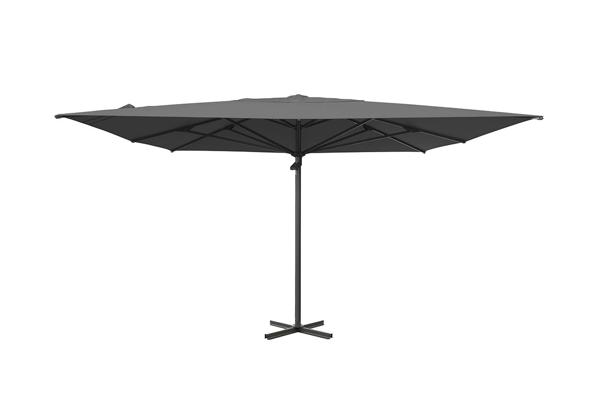 Denne store firkantede parasollen (4x4 m) har en ventilasjonsåpning og lerret laget av 300 gram farget polyester med vannavstøtende belegg. Parasollen må forankres, og en sokkel med kryss og bolter er inkludert (vekter selges separat).