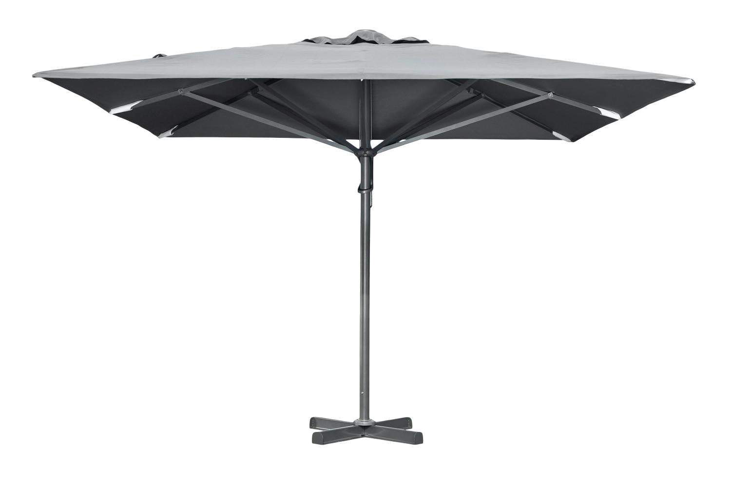 Lakkert aluminium med Ø 78 mm stang. Skjerm i PA-behandlet 300 gram polyester med vannavvisende belegg. Ventilasjonsluke. Sokkelkryss beregnet for lodd eller bolter og parasolltrekk er inkludert.