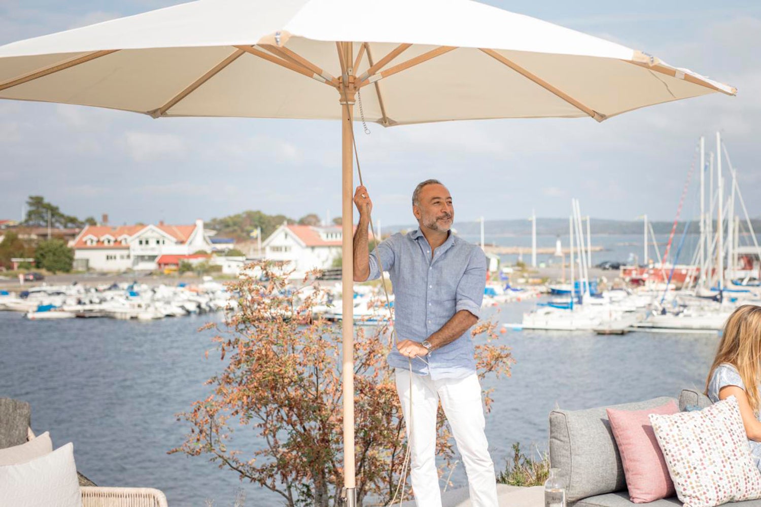 3,5 m parasoll av FSC-merket tre (bøk) med mattlakkert overflate. Vakre skinnmaljer og stoff laget av 250 g polyester.