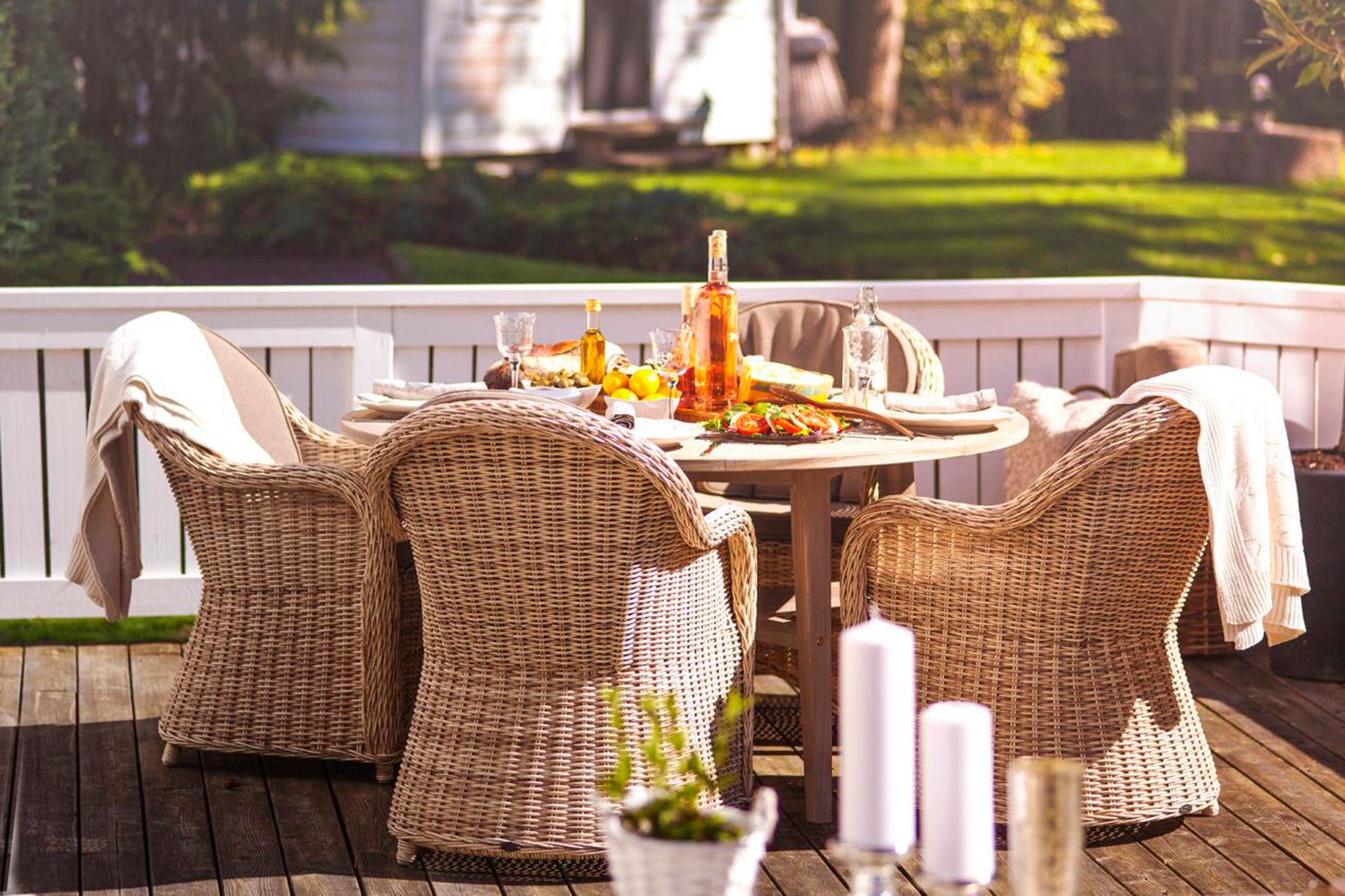 Våre klassiske Paulina, koselige og komfortable møbler laget av 5,3 mm rund syntetisk rotting flettet på en aluminiumsramme. Glassplater til bordene og olefinstoffputer til sitteplassene er inkludert.