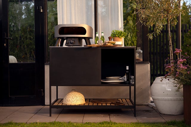 Laget for pizza. Forberedt på mer. Prep er det perfekte utekjøkkenet for pizzaovner og utendørs matlaging. Den sjenerøse arbeidsflaten er laget av børstet aluminium, som er ripebestandig og lett å rengjøre. Smarte detaljer som plass til en gassflaske og en praktisk hylle under gjør Prep både funksjonell og stilig.