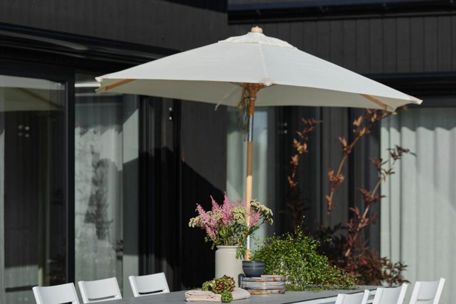 2,5 m parasoll i tre (bøk) med matt lakkert overflate. 2-delt stang med push-tilt. Vakre skinnmaljer og stoff laget av 250 g polyester.