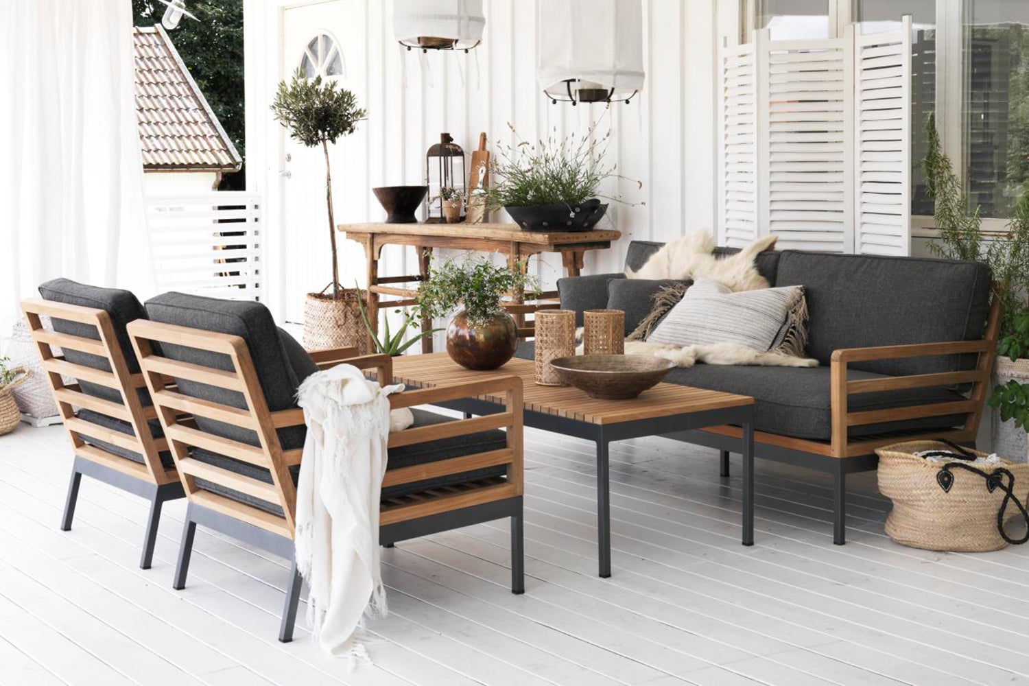 En svært elegant gruppe hvor kvalitetsbiff kombineres med benhyller i antrasittlakkert aluminium. De tverrgående teaklamellene forsterker inntrykket av kvalitet og eleganse. Sofaen har to dekorative puter og lenestolene en pute.
